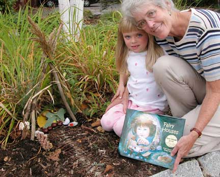 What a wonderful activity this is when vacationing, camping, or hiking. Children can enjoy building fairy houses almost anytime, and in all seasons. No wonder these whimsical structures are popping up everywhere - meadows, city parks, woods, beaches, and especially in backyards! Families have been building fairy houses on islands off the coast of Maine for decades. Interest in this phenomenon has been aroused lately due to the release of “The Fairy House Series” of children’s picture books and video, inspired, written and illustrated by Tracy Kane. “Connecting Kids and Nature …. with a pinch of Fairy magic!” is the motto. “The real goal of the series,” says Kane, “is encouraging children to discover the daily wonders of the natural world.” Two years ago, inspired by The Fairy Houses Series, community members of the Town of Falmouth in cooperation with the Baxter School for the Deaf and the Department of Conservation's Bureau of Parks and Land officially dedicated an area of parks land to a "Fairy Houses Village." This inspiring action has benefited the community with a permanent area on beautiful Mackworth Island for the recreation of building fairy houses! Kane is a resident of New Hampshire, and discovered fairy houses when vacationing on Monhegan Island. “I was captivated by partnering with nature to create these unpretentious habitats. It was the combination of ingredients an artist finds irresistible - creativity, nature ... and a pinch of fairy magic!” Gardeners and environmentalists are big fans of Fairy Houses. The “fairy village” theme opens up all kinds of ideas. Kane has done workshops at Garden Clubs, Horticultural Societies, Audubon Centers, as well as many Schools and Libraries throughout New England. The combination